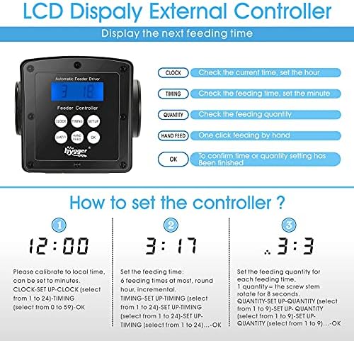 LCD DISPLAY CONTROLLER – the controller will display the next feeding time. Before set the feeding time and quantity, you should firstly set the contoller time to your local time,can be set to minutes. Then you set the feeding times (1 to 24) for each day, then you set the feeding quantities (1 to 9) for each feeding time.