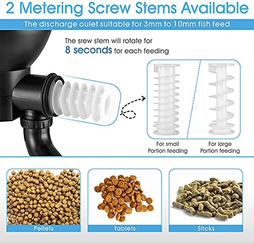 2 SCREW STEM AVAILABLE – the fish feeder comes with 2 sizes of metering screw stems, the narrow one is for small portion feeding, the wide one is for large portion feeding. Please note that for each feeding quantity, the screw stem will rotate for 8 seconds. The screw stem is suitable for 3mm to 10mm fish feed, for pellets,tablets, sticks
