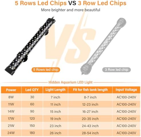 ★[Product Parameters]: Power: 8W; Led QTY: 30 PCS(White: 10 PCS/BLUE: 6 PCS/ RED: 1 PCS/ GREEN: 1 PCS/RGB: 12 PCS); CRI: 89; Application(for Fish Tnak Long): 8”-17” ; Power Cord: 6 ft+4.8 ft; Input Votage: AC100-240V; Output Votage: DC20V; Kelvin: White 6500K, Blue 455nm, Red 620nm; illuminance: 3149lx.