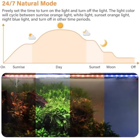 ★[Simulating 24/7 Natural Light Cycle]: Our aquarium lights astonishingly somulate the day-to-night cycle of natural light. It opens or closes slowly over 15 minutes, thus preventing light shock to the fish. From the warm morning sunlight to the rich spectrum at noon, to the soft blue light in the evening, it will make your aquarium look more mysterious and beautiful