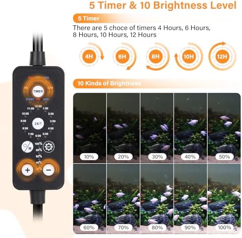 ★[DIY Mode]: This Full spectrum aquarium light can also change time + brightness + color. Set time(TIMER key): 5 kinds of time, 4h, 6h, 8h, 10h, or 12h; Brightness(+/- key): 10 kinds of brightness. Color(M key): White, Red, Blue, Green, Pink, Purple, Orange, Cyan, Cycle Color