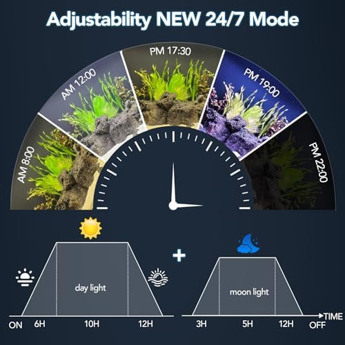 4 MODES TO CHOOSE: Only set daylight lighting, 3 timer options, color default. Only set moonlight lighting, 3 timer options, 10 brightness options, 8 single colors or cycle colors available. Set both daylight and moonlight lighting, run one after another. Manual control(always-on mode)