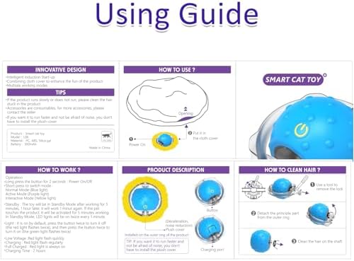 Automatic off every 5mins working, make kitty get restMotion cat toys could be wake up by pets touched, interacts cats when owners outPowerful motot inside, make ball running easily, even on blanket, wool carpetFast mode, slow mode, interactive mode (responsive interaction when touch)Chirping bird songs will make more funny, expecially under standby modeRechargeble battery inside, easily charging in 2hRecommend for high enerty kitty, young kitty, fat cats and adult cats