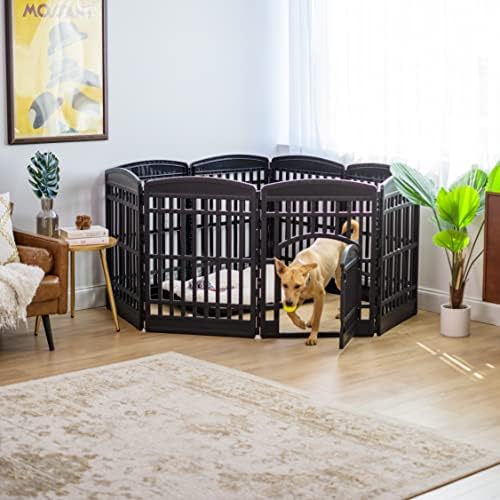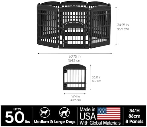 Take your pet’s playtime to the next level with the IRIS USA exercise playpen for medium to large sized dogs and other family pets. The easy assembly pen is as versatile as it is durable, giving you the option to use it as an indoor dog fence, play gate, dog play yard, or exercise pen and use it however you choose for years. Position it in different shapes to best suit your space capacities and fit your pet’s needs, and easily move your pet in and out of the exercise pen by using the door that’s built into the front panel and relax with the knowledge that the non-skid rubber feet will keep the pen in place and protect your floors. Let’s make life a little easier for the whole family.