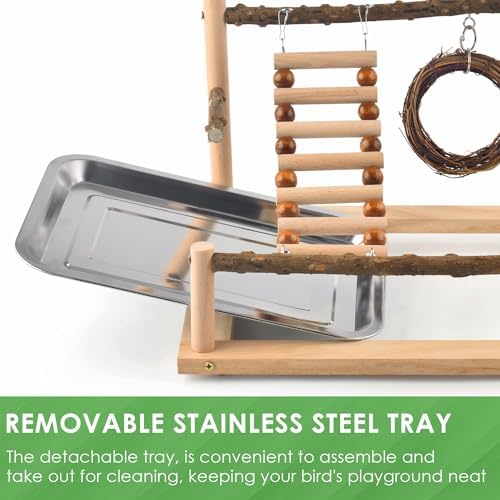 FUN BIRD PLAYSTAND: The conure play gym, comes with rattan chew toy, hanging swing and ladder, two feeding cups and a removable tray. Your bird can climb the assembled rotating perches, or swinging, or climb the ladder for digestion after enjoying treats. Easy to clean the cups and tray. A perfect cage addition to meet your bird’s daily play needs.