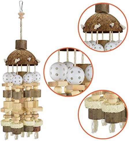 Safe to Chew: This bird cage accessory toy is made of natural wooden blocks, coconut shell, loofah and wadded rope, non-toxic ABS materials, safe and durable. Your pet birds can play and enjoy them without any worries.