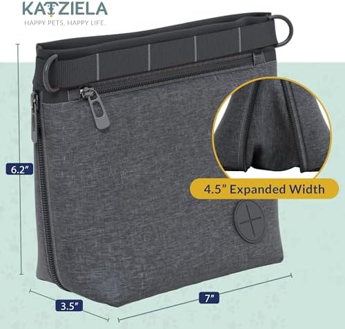 THE PERFECT COMPANION FOR EVERY DOG WALK Every outing with your dog should be enjoyable and hassle-free. Whether you’re taking a leisurely walk in the park, exploring rugged trails, or going for a jog – having everything you need close at hand makes all the difference. Introducing the Expandable Dog Treat Bag from Katziela. Designed to be spacious, versatile, and easy to carry, our innovative pouch expands to hold more treats plus all your essentials, so you’re always prepared for any adventure. Enjoy unique features you won’t find anywhere else: the top zipper provides the ultimate protection, while the expandable bottom zipper provides additional storage for up to 3 cups of treats (or 2 before expanding). A waterproof and removable washable Velcro liner keeps the bag clean and odor-free. UNIQUE FEATURES & BENEFITS: – Expandable bottom zipper for extra treat storage space – closing zipper for ultimate protection – Velcro lining: waterproof, removable, washable in sink ADDITIONAL FEATURES: 2 Side Pockets High Quality Expandable Shoulder Strap Adjustable Waistband Strap Clip for Belt 2 Loops for Leash Clip Poop Bag Dispenser DIMENSIONS: Length: 7 inches Width: 3.5 inches Expanded Width: 4.5 inches Height: 6.2 inches HOLDS EVERYTHING YOU NEED Say goodbye to juggling treats, poop bags, and keys in your hands. With our multi-pocket treat bag, all your things can be neatly stored and easily accessible. YOU CHOOSE: ZIPPER CLOSURE You’ll love the durable construction, the lightweight fabric that doesn’t weigh you down, and the clever design that includes a poop bag dispenser with hole for easy removal. The 4-magnet closure provides easy access to treats, with an optional top zipper to keep the pouch closed as needed.