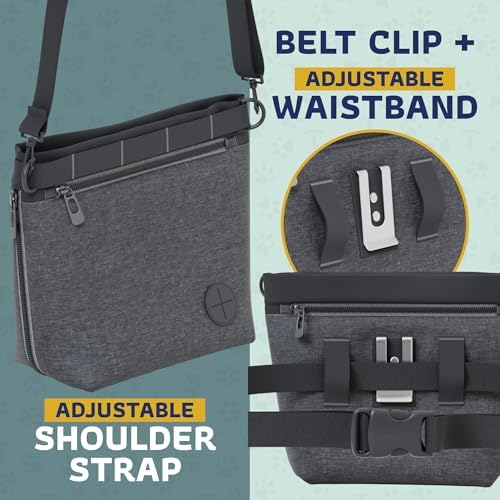 VERSATILE WEARING COMFORT — Our dog treat pouches for pet training have an adjustable strap that allows for versatile wearing options. Wear this dog treat holder around the waist, over the shoulder, or cross-body. Also includes a strong clip for attaching directly to a belt or pants.
