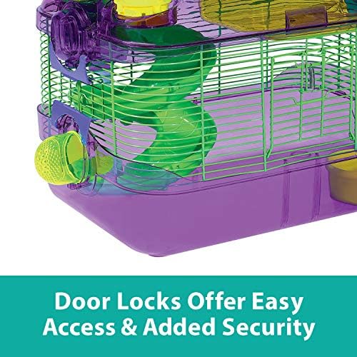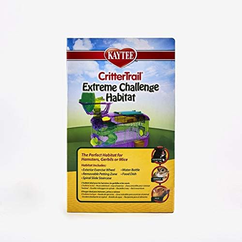 This complete habitat features an extreme exterior wheel and a fun spiral ramp to provide your pet with hours of extreme fun! The habitat also features a removable petting zone for instant interaction with your pet. This cage also comes with a food dish and water bottle for your convenience. Front wire door allows you to easily access your pet at any time. Ideal for mice, dwarf hamsters, hamsters and gerbils.