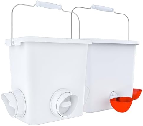 The chicken feeder kit includes: 2*2.6 gal feed buckets, 3 feeder ports, 3 chicken cups and hook accessories; The chicken feeder bucket hold 15-20lbs (different pellet feeds) chicken feed, feeds 3-8 chicken for about a week