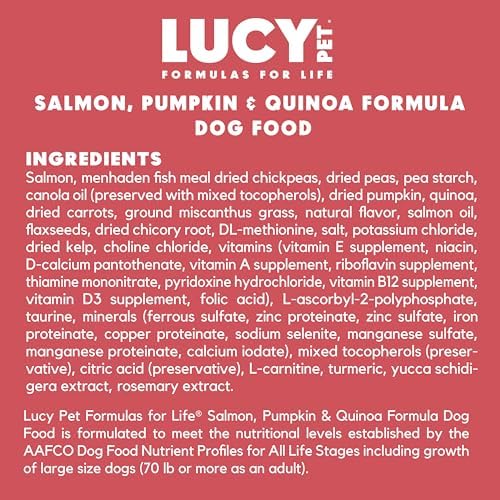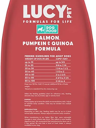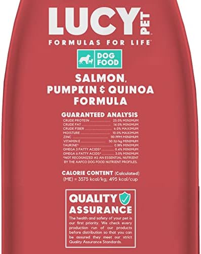 Lucy Pet Salmon, Pumpkin, and Quinoa Grain Free Formula features our advanced P.B.F. Prebiotic Balanced Fiber (TM) to produce an optimal environment in the digestive tract and help the body absorb nutrients more efficiently. The number one ingredient is Wild Alaskan Salmon and absolutely no salmon by-products, with fish being the single animal protein source. Includes chickpeas (rich in protein and complex carbohydrates, including starches and fibers), delicious pumpkin (a delicious nutritional powerhouse with fiber and protein that helps aid in healthy digestion), and quinoa, (a high quality, digestible seed rich in protein, containing essential amino acids). This formula includes a superfood blend of ingredients naturally preserved. No ingredients from China.