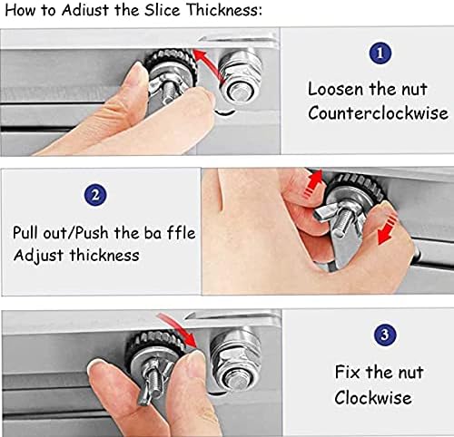 【SLICE THICKNESS HOW TO ADJUS】1. Loosen the nut for thickness adjustment Counterclockwise; 2. Pull out / Push the baffle, Turn the Black nut to adjust thickness; 3. Fix the nut Clockwise