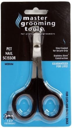 Master Grooming Tools stainless steel nail scissors with black vinyl-coated handles. Medium angled scissors are ideal for small to medium dogs and small animals. Each is blister-packed for retail. Items may be combined for quantity discounts. Available in medium size. Measures 5-inch length.