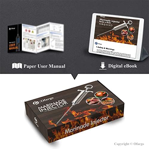 Absolutely safe contact meat injector kit Premium safe 304 stainless steel, anti-leak, long-lasting to use 3 types of needles for various meat or poultry; Precision needles for different marinades or sauces, non-clogged design Cute green silicone basting brush 2 small cleaning brushes for needles 6 replacement O-rings Great Ofargo eBook (Need to be Download PDF)