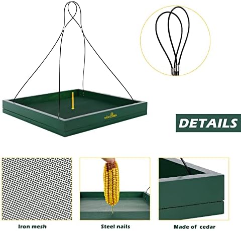 Strong Framing Bird Feeder Tray with Free Nails : The double layers of the bird feeder tray are very strong and sturdy for food weight. You can store enough seeds to be fed for a month or so. Also, the nails provided with the tray will be very useful for you to prepare corn for squirrels. You can easily adjust the nails with the length you want for the corn preparation for your lovely squirrels
