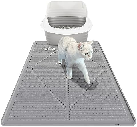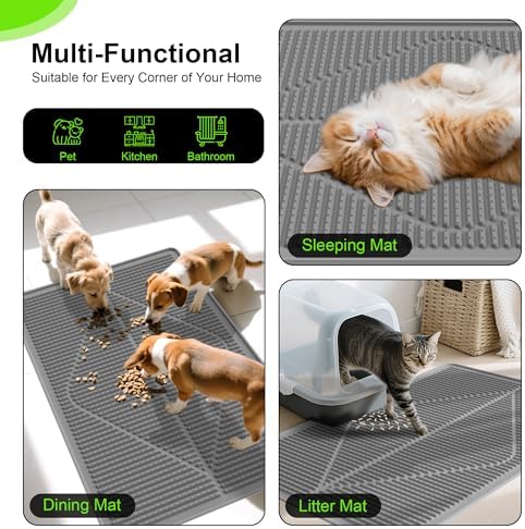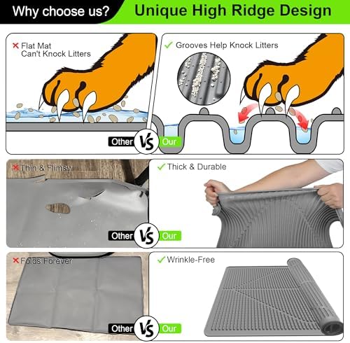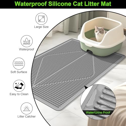 Waterproof/Urine Proof : The litter box mat is made of Premium Grade Silicone is waterproof and super non slip which prevent liquid to go through the mat and onto your floors,easy to clean, just hose it off if cat vomit on the mat,Protect your hardwood floors and carpets from nasty urine stains.Prevent the cat’s urine from getting everywhere.