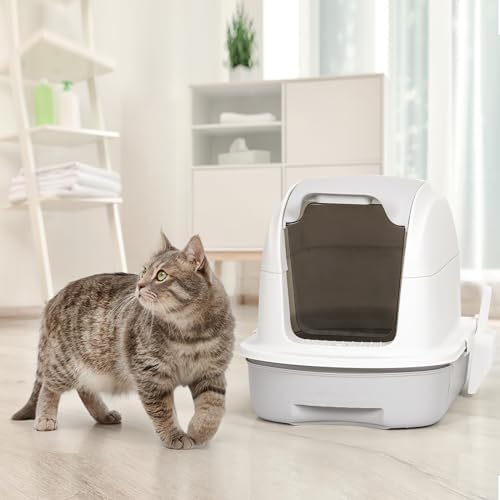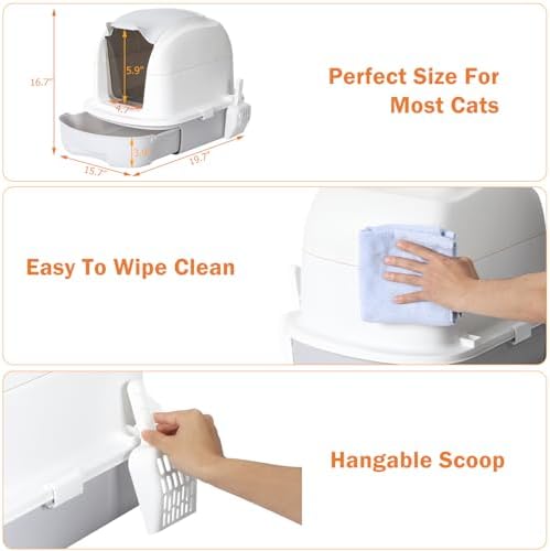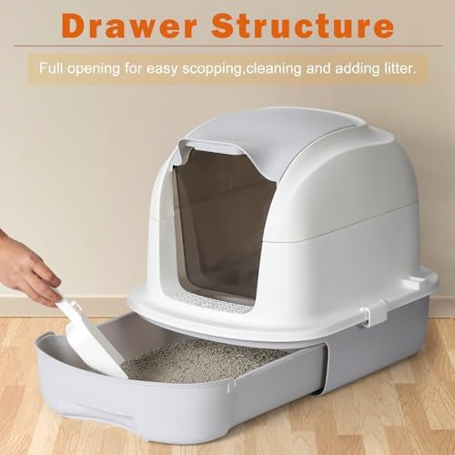 Easy to empty the litter: The cat litter box with lid features a pull-out drawer design, making it easier to clean and replace the litter compared to traditional cat litter boxs. The cat litter box is equipped with a litter scoop that can be hung on the side of the litter box when not in use.