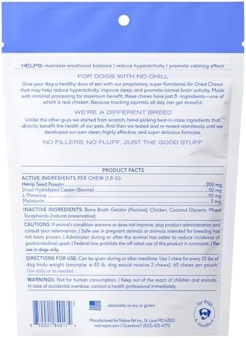 INNOVATIVE AIR-DRIED FORMAT: Our air-dried hemp dog chews and calming treats deliver potent dog anxiety relief without the junk. Minimally processed and packed with functional ingredients, including dog melatonin for large dogs & small pups.