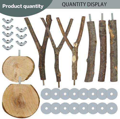 You will receive 8 PCS wooden parrot perch stand, including 3 PCS hanging multi-branch perch for cage 3 PCS wooden parrot perch stand,2 PCS natural round wooden stand platform, and enough quantity wooden perching platform for daily rest and entertainment of birds.