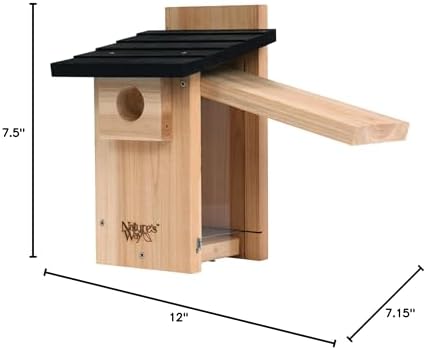 Nature’s Way Cedar Bluebird Viewing House is made with premium Cedar and stainless steel rust-free hardware for a durable house that will last multiple seasons. This model includes a stay-clear, crack-resistant viewing window to allow for nest viewing while protecting the young. Air vents allow for proper air ventilation through wall and floor openings to promote bird health. Clean-out doors provide easy access for cleaning. An elevated mesh floor aids in the management of blowfly to protect hatchlings. An added predator guard extends the entrance hole to protect young birds against predators. Fledgling kerfs provide extra grip for the young to climb out. The innovative design can be installed with a pole mount or flush mount.