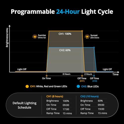 Provides more options to adjust the auto On/Off time and brightness. Featured 15 or 30-minute ramp-up and dim-down to simulate natural sunrise and sunset, waking the fish up in soft lighting and ensuring a good sleep with complete off at night