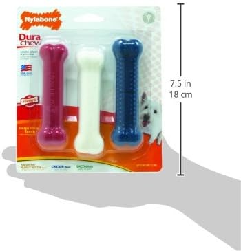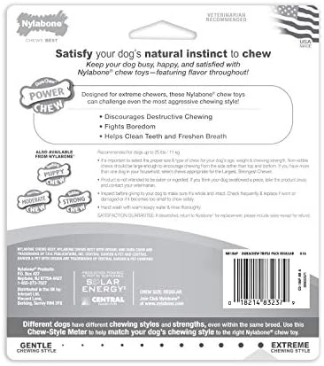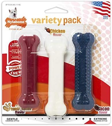 Intended to challenge the most aggressive chewers, this Power Chew twin pack contains two durable dog chew toys made of sturdy nylon. Each chew toy offers long-lasting entertainment and promotes dental health, giving your dog two fun ways to stay busy and help maintain clean teeth. The chicken-flavored chew toy comes in a real bone shape and keeps dogs occupied with its unique textured surface. The Flavor Frenzy dog bone chew toy features savory beef jerky flavor throughout and includes dental nubs and ridges to help reduce plaque and tartar buildup through chewing action. These tough chew toys are proudly made in the USA and will provide your best friend twice the chewing excitement!