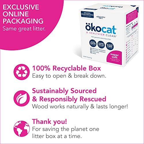 Switch to a superior natural cat litter that’s cleaner and healthier for your feline, family, and home. Our next-generation kitty litter is made entirely from sustainably sourced, responsibly rescued natural wood fiber. Free from harmful chemicals, synthetic dyes, and artificial fragrance, ökocat litter boasts outstanding plant-based odor control. Best of all, our biodegradable clumping formula is free from powdery clay dust and compostable or flushable for added convenience and cleanliness. oko is German for “eco” or ecological, meaning green or organic. okocat litter is made from 100% reclaimed wood that comes from the earth and can be returned to the earth. Our online exclusive packaging is recyclable and easy to break down with a leak-proof bag inside. Just cut open the bag corner then pour from the designated box corner or scoop into litter box.
