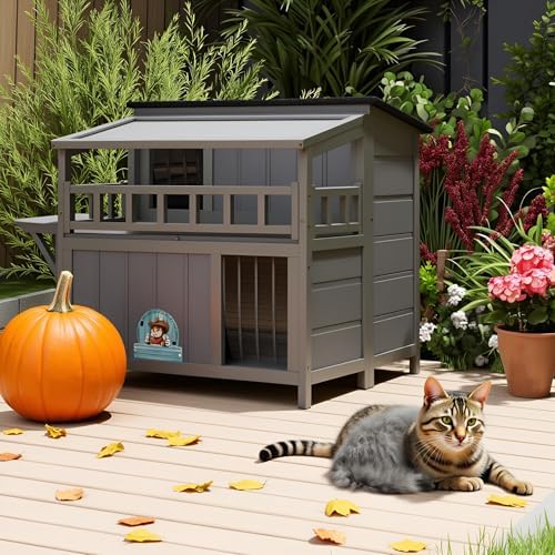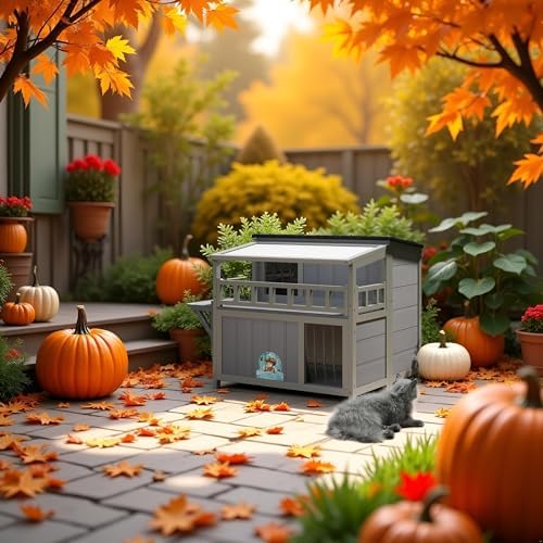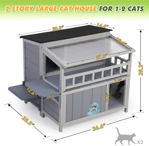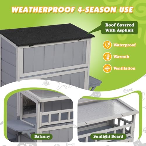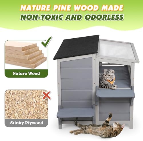 【All-Weather Wood Construction】: Crafted from premium pinewood with an asphalt-covered roof, a sunshine roof, and an elevated bottom, this cat house is durable for backyards, gardens, patios, or porches, keeping kitties away from rain, snow, and wind.