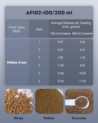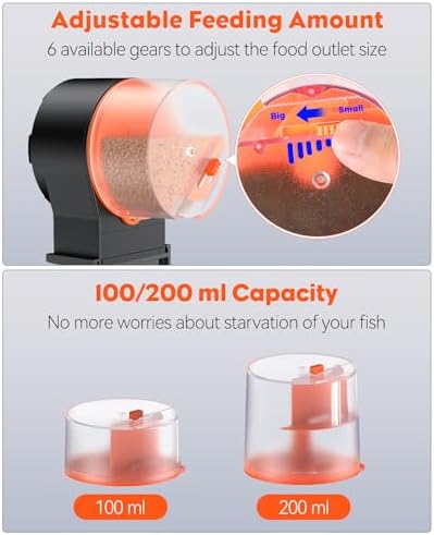 Adjustable Feeding Amount: Simply move the slider left and right to adjust the food outlet size (6 gears available). The auto vacation fish feeder is only suitable for holding dry fish food like Pellets, Granules and Strips(Not suitable for Flakes).