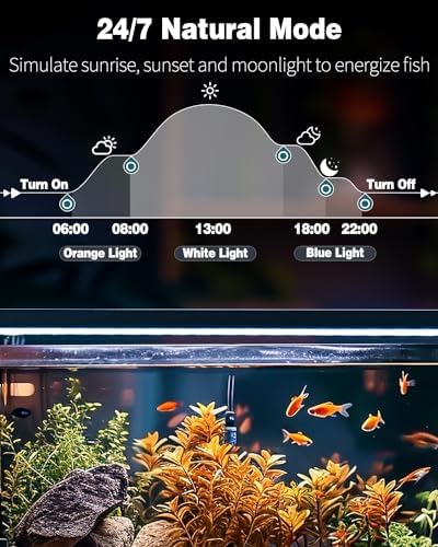 24/7 Natural Mode: The LED light automatically starts at 6 a.m. and turns off at 10 p.m. Simulate the natural changes from sunrise, sunset to moonlight throughout the day, greatly energizing your fish and giving them a sound sleep.