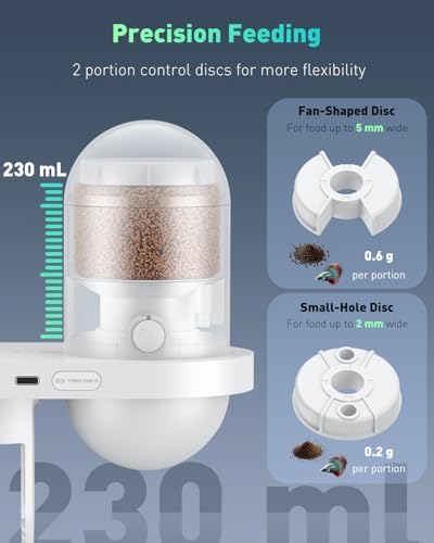 Precision Feeding: 2 interchangeable portion control discs for more flexibility – the small-hole disc dispenses 0.2 g per portion for smaller fish, while the fan-shaped disc releases 0.6 g for larger appetites. You can set up to 20 portions per feeding