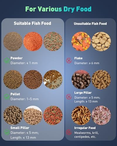 230 mL Capacity: The auto fish feeder perfectly accommodates most dry food, including Powder, Pellets, and Small Pillars up to 5 mm wide and 13 mm long. NOT suitable for krill, flakes, or mealworms! The normally closed food outlet keeps food fresh