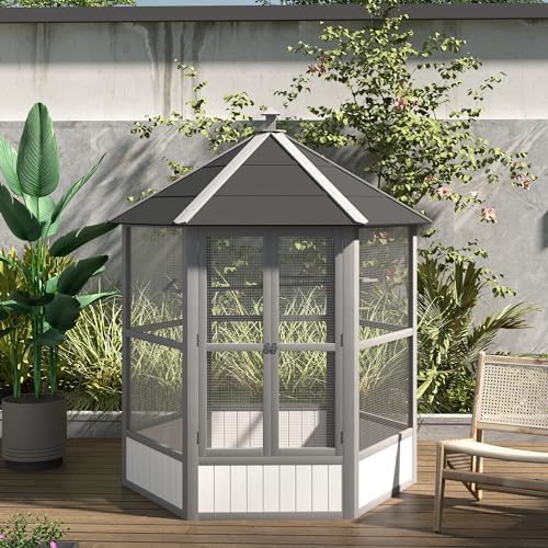 Your fine feathered friends will love the roomy interior of this giant bird cage from PawHut where there’s always room to perch and play. The natural space offers plenty of fresh air and sunshine for happier birds. This extra large bird house is made of lightweight fir wood and metal wire for security and durability. 2 large doors allow for easy access. With water-resistant composite asphalt roof and finish, this finch cage is suitable for indoor and outdoor.