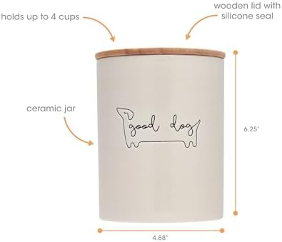 Dishwasher Safe: This beige ceramic treat canister with a neutral wooden lid features a silicone seal to keep your dog food fresh. This treat jar is microwave safe and dishwasher safe making it easy to clean