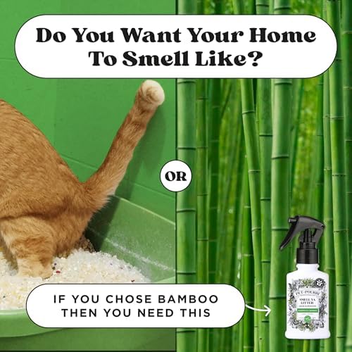 Poo-Pourri Smell Ya Purrfectly Bamboo Litter Deodorizer Spray Love your cat, not their litter box smell? That’s where Pourri Purrfectly Bamboo Cat Litter Deodorizer Spray comes in. With just a few spritzes, our Proprietary Funk Lock Technology neutralizes tough odors—especially strong urine and litter box smells—so your home stays fresh and inviting. Infused with a relaxing blend of Bergamot, Jasmine, Bamboo and Pear, it refreshes the air and fabrics while keeping your litter box smelling clean between scoops. Suitable for whole-home freshness, Purrfectly Bamboo works in the air, on furniture, rugs, curtains, and any place kitty funk lingers. Made with natural, plant-based ingredients and essential oils, this litter box spray is never tested on animals and contains no dyes, sulfates, parabens, or phthalates, gentle enough to spray directly in the litter box. Simply spritz 3-5 times inside the clean litter box, fill with litter, and enjoy a fresh, clean scent as it freshens the odor.