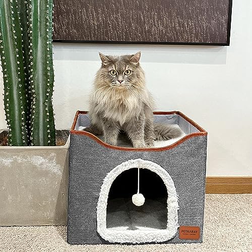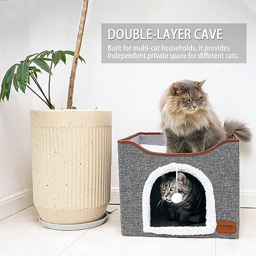 DOUBLE-LAYER CONDO: Size 16*16*14 inches. Built for multi-cat households, it provides independent napping areas for different cats. The foldable cushion features fluffy and soft for all-season comfort.