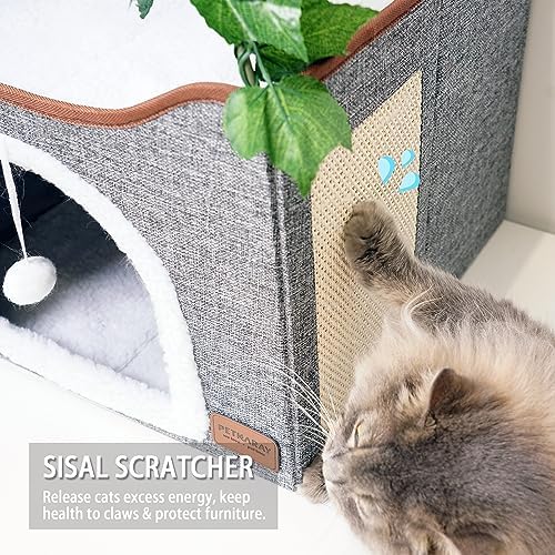 PRIVATE COZY CAVE: The enclosed cat house is perfect for hideaway, your cat deserves own private space. The hanging plush ball and scratching board keep cats stay curious and release excess energy.