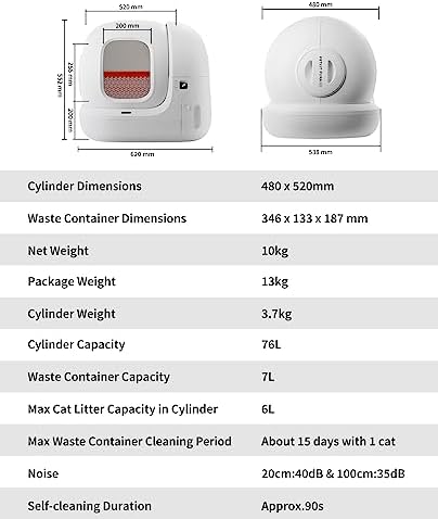 Extra Large Capacity for Large Cats and Multi-cat Family: Size of the inner bucket: 18.89 x 20.47 inch(diameter), 76L large space is enough for cats up to 18 lbs,7L large waste bin allows up to 15 days of free scooping for one cat. The 7.8 inch low-entry design is friendly to older cats, short-legged cats, and cats with limited mobility.