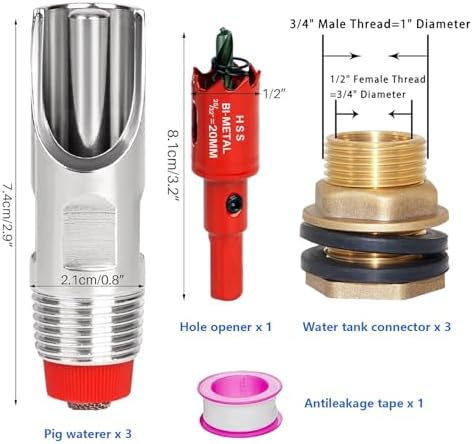 【Easy to install】1. Punch holes with a hole opener. 2. Install the connector on the water bucket wall. 3. Wrap PTFE tape around the pig waterer and install it. remind:Use PTFE tape and washers when installing to