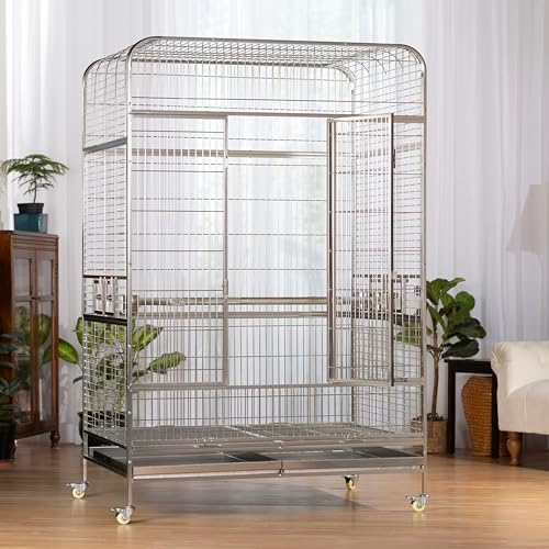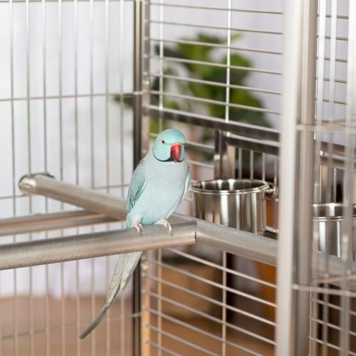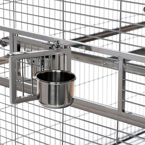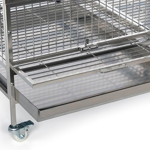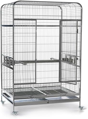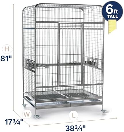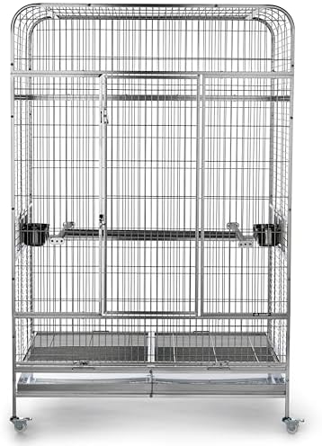Imperial XXL Stainless Steel Bird Cage (#3458) from Prevue Pet Products is designed for the largest birds and a lifetime of use. Checking in at 4-ft wide and just over 6-ft tall, there’s space for toys, accessories, natural perches, and still room to spread that large wing span. Stainless steel is hygienically superior because the surface is smooth, hard, non-porous, doesn’t pit, and resists rust and corrosion. The surface is easy to clean and holds up well under wear, maintaining its original look for years longer than the alternatives. Stainless steel is also 100% completely and infinitely recyclable, making it the greenest choice among all cage options. Cage features include locking rubber wheel casters, an H-shaped stainless steel perch, four food/water cups, half-cage floor grilles and debris trays, and bird-resistant door locks. The best cage you can buy and last cage you’ll need. Full dimensions (including wheels): 49″L x 38-1/2″W x 74″H. Wire space: 1″. Wire gauge: 8.