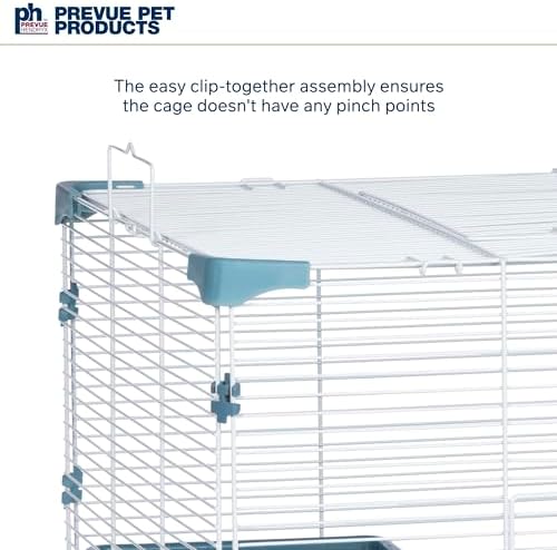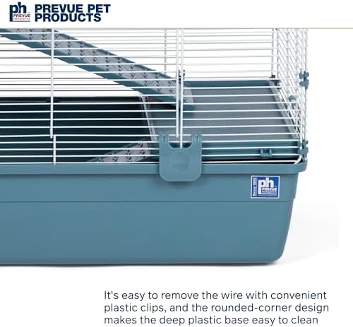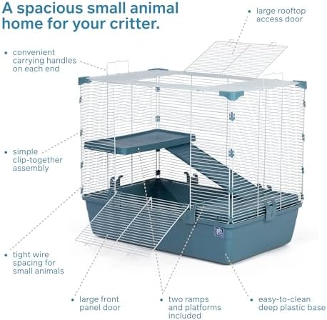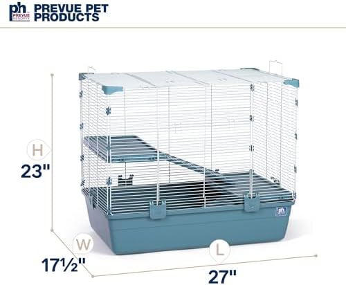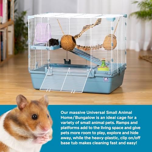 Prevue Pet Products Universal Small Animal Home / Bungalow #5529 is a spacious home with tight 3/8″ wire spacing, making it ideal for a wide variety of small animals including hedgehog, hamster, gerbil, rat and mouse. This large cage has a 6″ deep tubby base with rounded edges, which contains mess and is easy to clean. Your pet will get plenty of exercise exploring the tubby and climbing on the two sturdy plastic ramps and two large plastic platforms. Each platform measures 16″ long by 8 7/8″ wide and each ramp measures 15 1/4″ long by 5″ wide. Pet parents can comfortably carry the cage using the integrated carrying handles. Interact with your pet through one of two large doors located on the front and top of the cage. Each door measures 13″ long and 10″ wide and closes securely with a wire latch locking mechanism. The mesh clips-together, is easy to assemble and is held securely in place with six base clips. Expertly designed in the USA, all Prevue cages undergo independent lab testing to conform to the highest levels of pet safety. Lightweight for easy handling and convenient traveling, our Universal Small animal Bungalow measures 27″ long, 17 ½” wide and 23″ high with 3/8″ wire spacing.