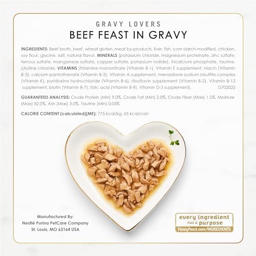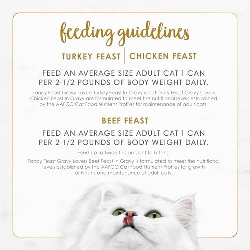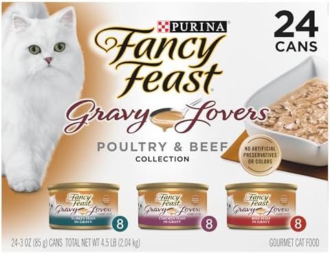 Offer your discerning cat the gourmet tastes she loves with Purina Fancy Feast Gravy Lovers Poultry and Beef Feast Collection wet cat food. Chicken, turkey and beef give this collection the savory taste she craves, and the rich gravy in every serving of this canned cat food is sure to have her licking her dish clean. Small, delicate bites slow-cooked to perfection deliver a tempting texture, and the assortment of flavors makes it easy to keep your cat’s curiosity piqued at mealtime. With essential vitamins and nutrients to support her overall health and wellness, this gourmet wet cat food lets you feel good about the foods you put into her dish. Offer up a different delectable flavor at each feeding, and show your feline friend just how important she is to you and your family with this collection of mouthwatering Fancy Feast Gravy Lovers cat food cans. She shouldn’t have to wait for dinner, and you shouldn’t have to, either. Get Purina Fancy Feast wet cat food fast from Amazon.com.