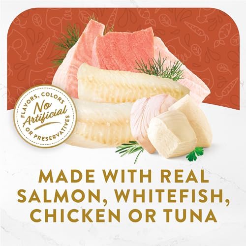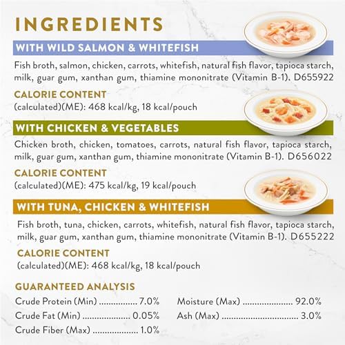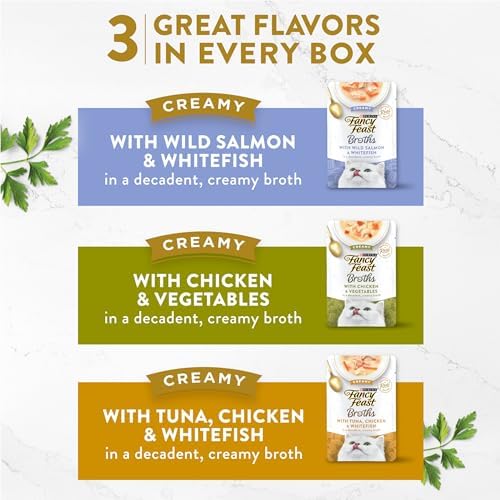 Add gourmet goodness to your kitty’s dish with selections from the Purina Fancy Feast Broths Creamy Collection wet cat food complement variety pack. We craft each gourmet cat food mixer with real poultry or seafood and drench them in a creamy broth cats can’t wait to lap. Pour one of these premium cat food mixers over her favorite food to amp up flavor at mealtime, or serve these wet cat food pouches alone as lickable, lappable snacks. Our Chicken and Vegetables recipe is sure to satisfy her poultry cat food cravings and our Salmon and Whitefish and Tuna, Chicken and Whitefish recipes are sure to send her on a deep-dive of flavor. It’s easy to make any moment more delightful with Fancy Feast Broths. With no artificial flavors, colors or preservatives, you can feel confident serving these broth cat food toppers any time of day. They deliver the great taste Fancy Feast is known for in limited ingredient cat food mixers specially designed for sophisticated cats like her.