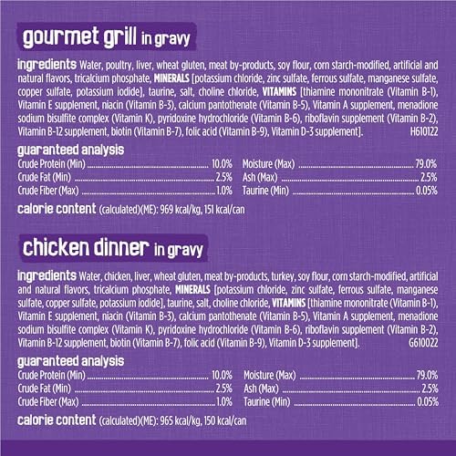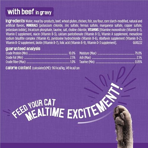 Make mealtime a meaty adventure with Purina Friskies Meaty Bits cat wet food variety pack. Three mouthwatering varieties in every pack give your cat the taste combinations she craves, and the tender bite-sized chunks deliver a tempting texture she’s sure to appreciate. With beef, chicken, and poultry flavors to choose from, this pack makes each meal a treat for her taste buds. Let her delight in the intriguing aroma that tempts her to her dish, and watch as she laps up the savory gravy found in every recipe. Each serving provides 100 percent complete and balanced nutrition for adult cats, offering the optimal nutrition & balanced diet she needs. Get the variety your cat loves along with the convenience and quality you demand with this Purina Friskies Meaty Bits moist cat food variety pack. Surprise your curious cat with a different flavor at every feeding, and watch as she happily nibbles her way through each delightful meal.