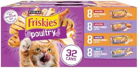 Keep your adult cat’s palate happy with the variety of delicious flavors in this Purina Friskies Poultry wet cat food variety pack. Each of this variety pack’s 32 meals is crafted to deliver nutrition that is 100 percent complete and balanced for the maintenance of adult cats. Alternate between different recipes of rich, savory chicken and turkey to give her the high-quality protein she needs to help promote strong muscles and an active lifestyle. The different textures of poultry, from prime filets to savory shreds and meaty bits, gives her a range of consistencies that she loves and that keeps her running back for more at each and every mealtime. With eight cans of each wet cat food flavor in this case, you have enough of each type for several dinners, or you can switch between flavors to keep each feeding varied and fun for her. Help satisfy your cat’s cravings with the delicious goodness found in every can of this Purina Friskies wet cat food variety pack.