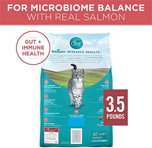 Feed your cat the crunchy bites and meaty morsels she adores with Purina ONE Tender Selects Blend With Real Salmon adult dry cat food. What are the ingredients in Purina ONE? Purina Tender Selects salmon cat food uses a SmartBlend of real ingredients, including accents of carrots and peas. This adult, natural cat food has added vitamins, minerals and nutrients for balanced nutrition. Real salmon is the first ingredient, helping provide the protein your cat needs to support strong muscles. Plus, the digestive care cat food has natural prebiotic fiber for gut health and immune support. With added calcium, the crunchy cat food kibble helps maintain her strong teeth, too. All Purina ONE cat food ingredients serve a purpose, creating digestive health cat food with 0 percent fillers. Check the bag for the calories per serving, feeding chart and instructions on changing cat food, and take our 28 Day Challenge to see the difference Purina ONE Tender Selects salmon cat food can make.