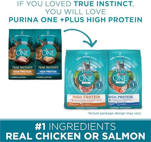 Provide your cat the natural nutrition she instinctively craves with Purina ONE True Instinct Grain Free With Real Chicken natural adult dry cat food with added vitamins, minerals and nutrients. Crafted by a veterinarian-recommended brand, this high protein dry cat food delivers a SmartBlend of natural ingredients backed by research. With 100 percent nutrition and 0 percent fillers with no poultry by-product meal or artificial colors, flavors or preservatives, every ingredient has a purpose. The premium grain free cat food starts with real chicken as the number 1 ingredient and provides 35 percent protein to help promote her strong muscles, including her healthy heart. Crunchy bites and tender, meaty morsels provide textural variety like cats get in nature. Plus, the crunchy cat kibble, along with added calcium, helps support her strong teeth and healthy gums. Omega-6 fatty acids in this high protein cat food support her healthy skin and radiant coat, and four antioxidant sources promote a strong immune system.