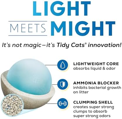 Trust your litter boxes to the power of two big names in odor control with Purina Tidy Cats LightWeight With Glade Clear Springs clumping multi cat litter. This Tidy Cats lightweight litter neutralizes ammonia, urine and fecal odors, keeping each litter box smelling clean and pleasant. A powerful Ammonia Blocker prevents ammonia odor from forming for 14 days when used as directed, and the low dust cat litter formula enables a clean, easy pour during litter changes. With Glade, this scented cat litter defends against strong odors, leaving behind a fresh fragrance. At less weight than leading clumping kitty litter, this scoopable cat litter from Tidy Cats forms strong, tight clumps, making litter box maintenance a simple task. Formulated for multiple cats, this cat litter box odor control formula with Glade Clear Springs stands up to regular use by all your feline family members, and the moisture-locking technology keeps them dry and comfortable.