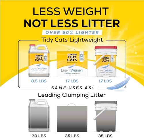 Provide powerful odor protection to your cats’ litter boxes with Purina Tidy Cats LightWeight 4-in-1 Strength clumping litter. Formulated with an advanced deodorizing system, our odor control cat litter attacks and neutralizes urine, fecal, ammonia and bacterial odors on litter. This scented litter has a complex floral scent that leaves cat boxes smelling fresh, clean and ready for your feline friends. Formulated for households with multiple cats, this low dust cat litter keeps ammonia odor from forming for 14 days when used as directed. The light, powerful clumps make scooping quick and effortless, and Tidy Cats LightWeight litter is half the weight of leading clumping kitty litter formulas, so it’s easy to carry our scoopable cat litter to your cats’ litter areas whenever you need to refill their boxes. Check litter box maintenance off your to-do list and lighten your load with this Purina Tidy Cats lightweight cat litter that may just have you saying, “Toss me that litter.”
