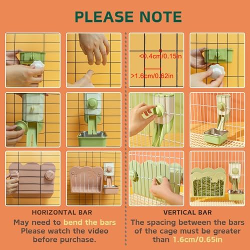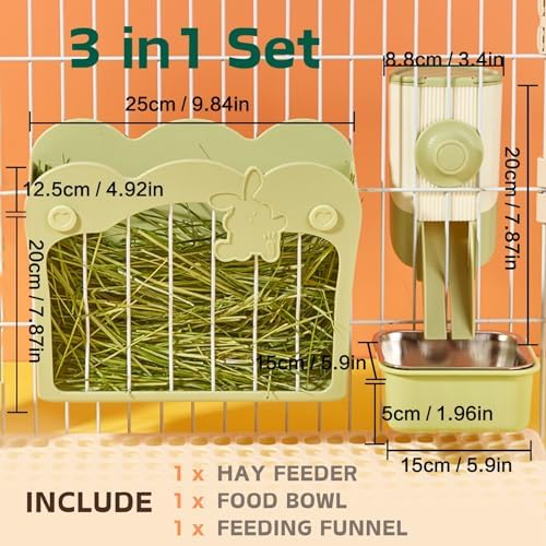 The package includes a hay rack, a bowl and a funnel. No tool is required, easy to install. Please make sure the vertical bar gap must be greater than 1.6cm, and you need to bend the horizontal bar when installing the feeding funnel.